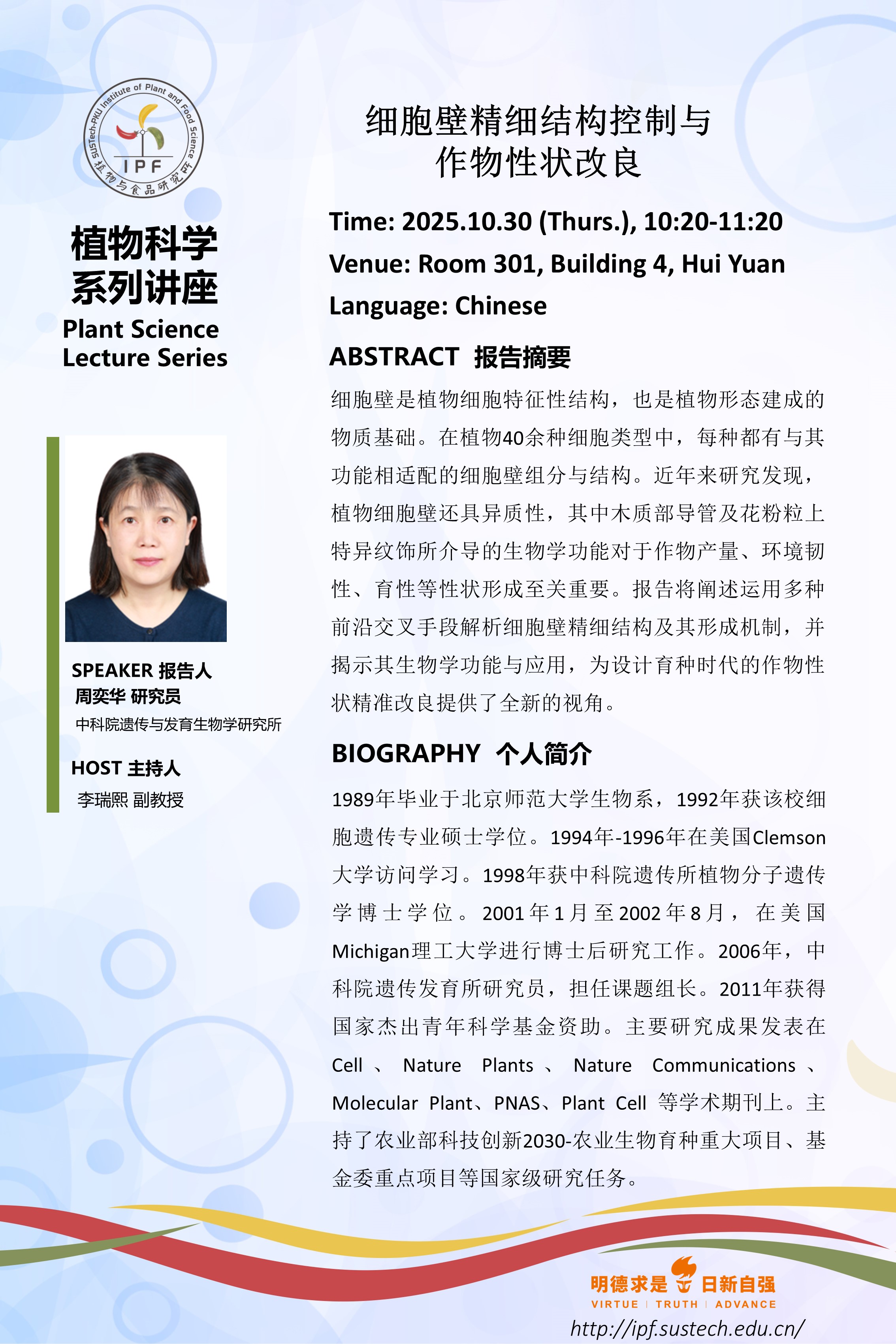 报告摘要:细胞壁是植物细胞特征性结构,也是植物形态建成的物质基础。在植物40余种细胞类型中,每种都有与其功能相适配的细胞壁组分与结构。近年来研究发现,植物细胞壁还具异质性,其中木质部导管及花粉粒上特异纹饰所介导的生物学功能对于作物产量、环境韧性、育性等性状形成至关重要。报告将阐述运用多种前沿交叉手段解析细胞壁精细结构及其形成机制,并揭示其生物学功能与应用,为设计育种时代的作物性状精准改良提供了全新的视角。