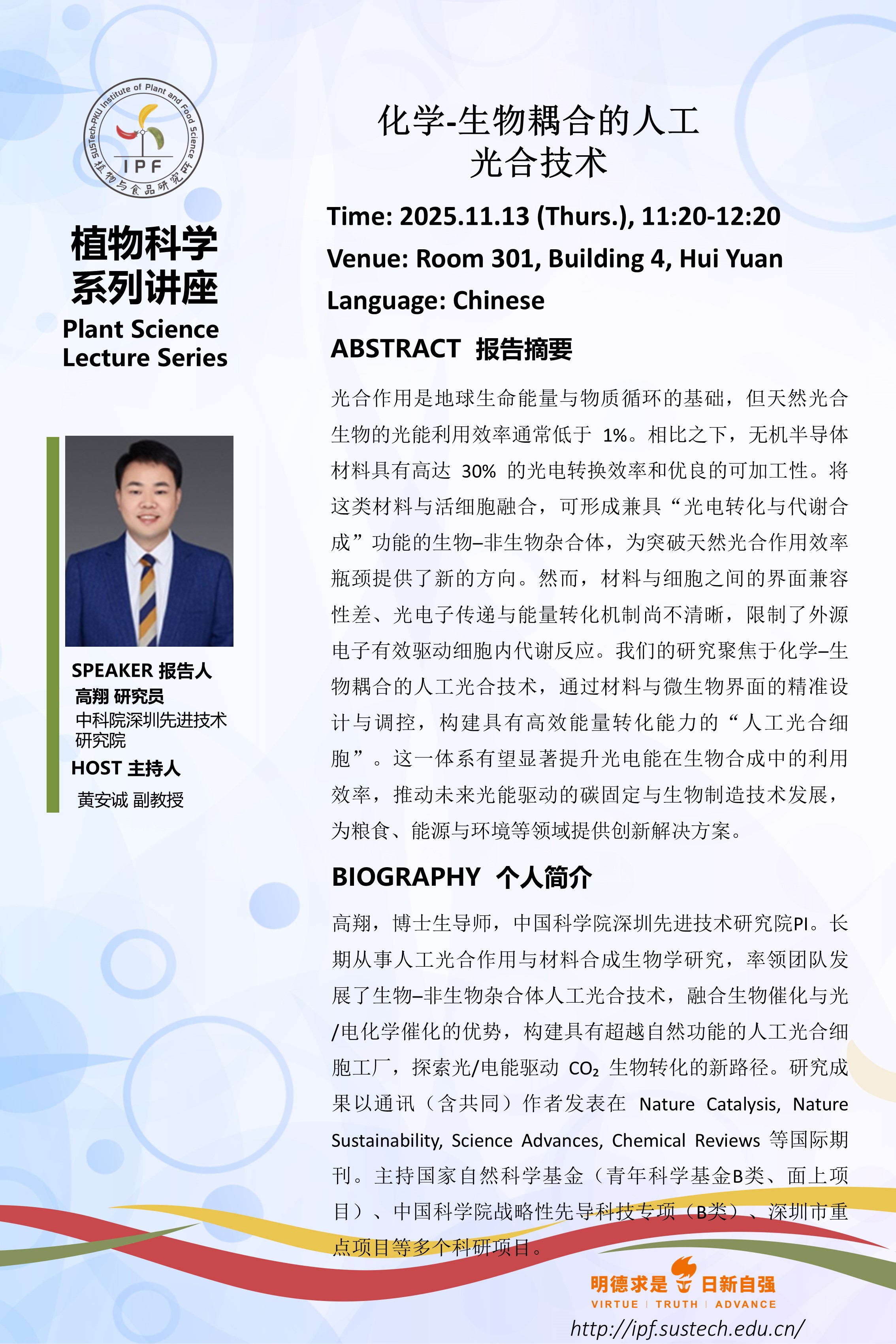个人简介:高翔,博士生导师,中国科学院深圳先进技术研究院PI。长期从事人工光合作用与材料合成生物学研究,率领团队发展了生物–非生物杂合体人工光合技术,融合生物催化与光/电化学催化的优势,构建具有超越自然功能的人工光合细胞工厂,探索光/电能驱动 CO₂ 生物转化的新路径。研究成果以通讯(含共同)作者发表在 Nature Catalysis, Nature Sustainability, Science Advances, Chemical Reviews 等国际期刊。主持国家自然科学基金(青年科学基金B类、面上项目)、中国科学院战略性先导科技专项(B类)、深圳市重点项目等多个科研项目。