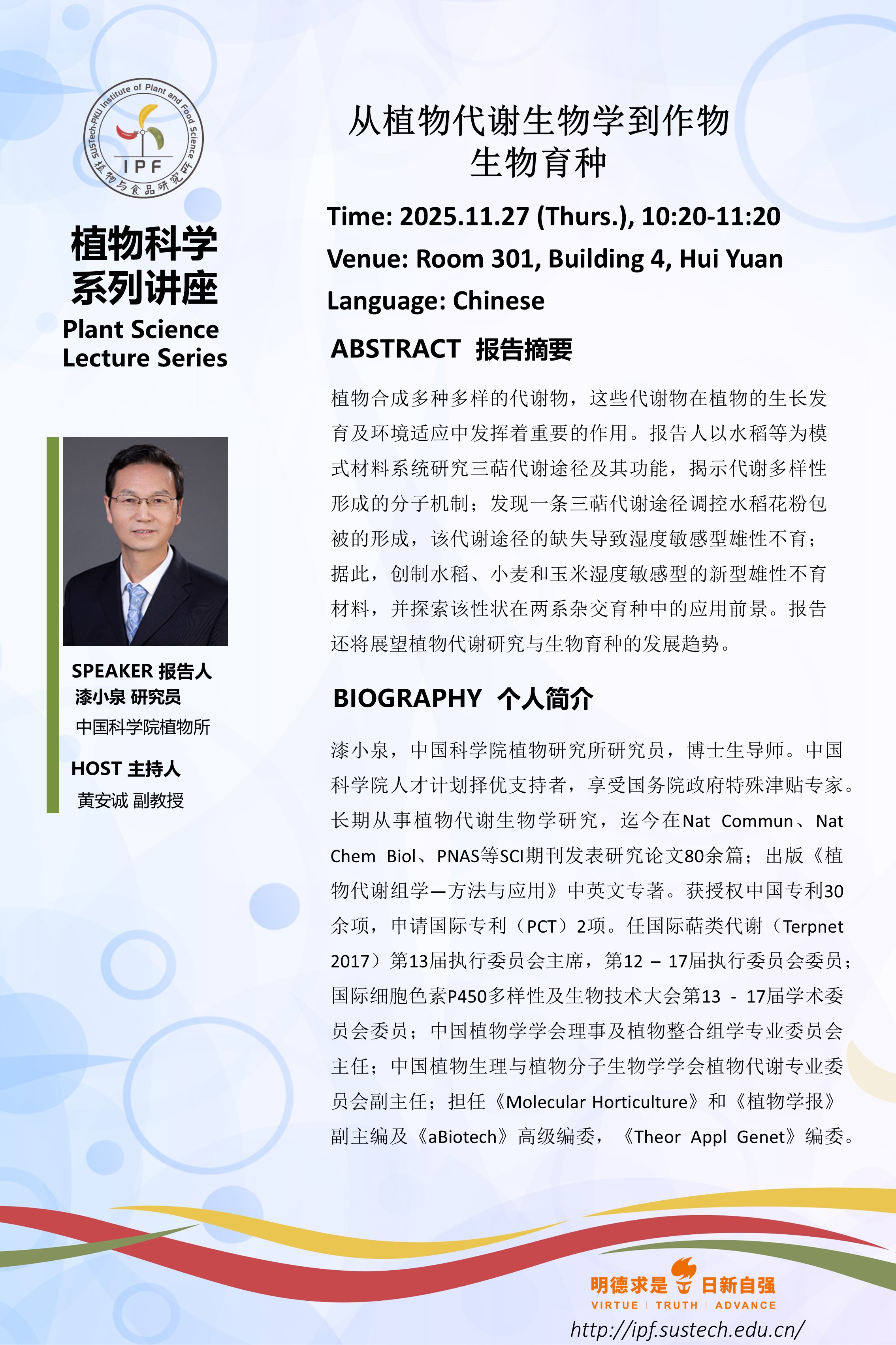 报告摘要:植物合成多种多样的代谢物,这些代谢物在植物的生长发育及环境适应中发挥着重要的作用。报告人以水稻等为模式材料系统研究三萜代谢途径及其功能,揭示代谢多样性形成的分子机制;发现一条三萜代谢途径调控水稻花粉包被的形成,该代谢途径的缺失导致湿度敏感型雄性不育;据此,创制水稻、小麦和玉米湿度敏感型的新型雄性不育材料,并探索该性状在两系杂交育种中的应用前景。报告还将展望植物代谢研究与生物育种的发展趋势。