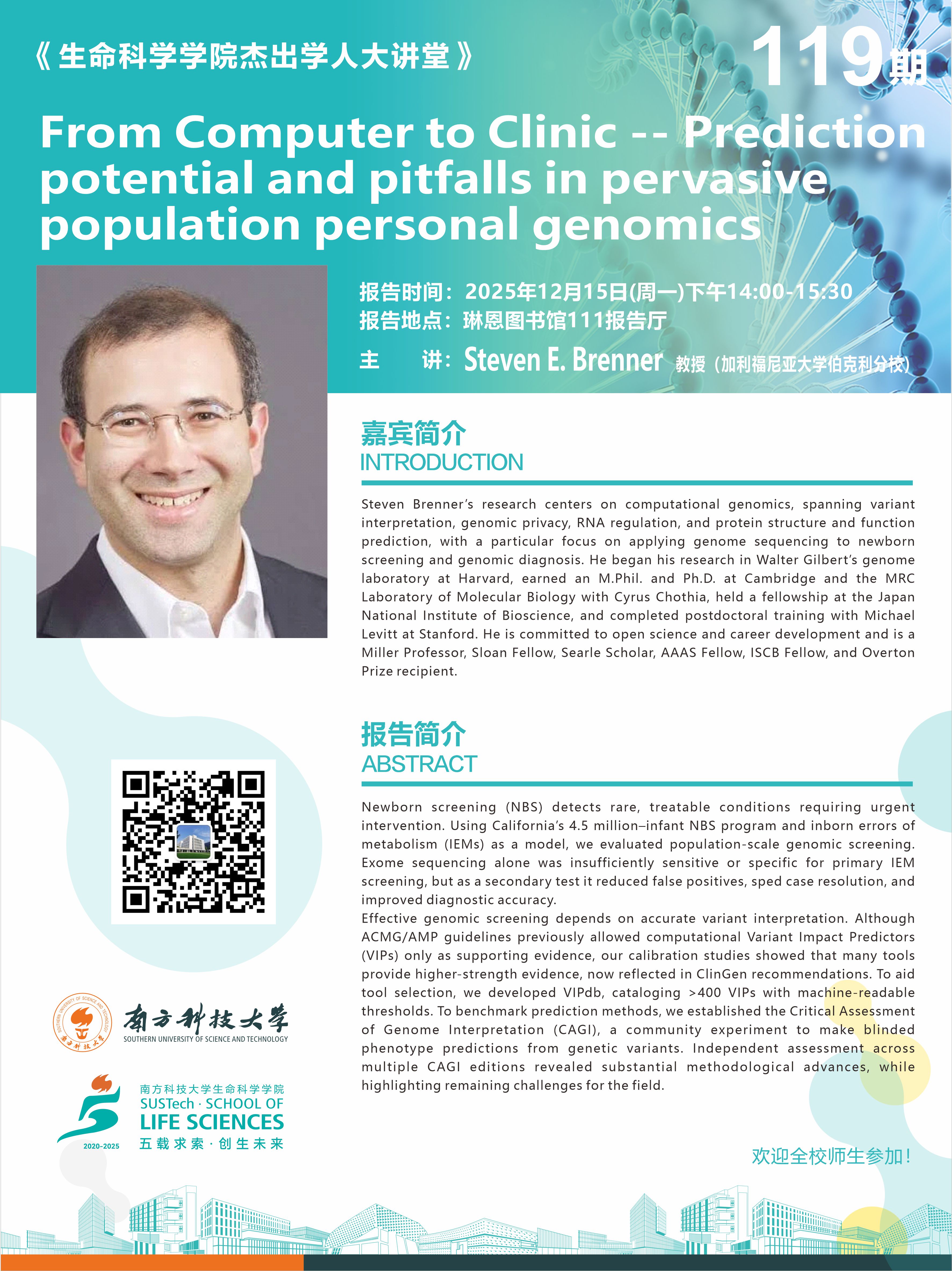 Steven Brenner’s research centers on computational genomics, spanning variant interpretation, genomic privacy, RNA regulation, and protein structure and function prediction, with a particular focus on applying genome sequencing to newborn screening and genomic diagnosis. He began his research in Walter Gilbert’s genome laboratory at Harvard, earned an M.Phil. and Ph.D. at Cambridge and the MRC Laboratory of Molecular Biology with Cyrus Chothia, held a fellowship at the Japan National Institute of Bioscience, and completed postdoctoral training with Michael Levitt at Stanford. He is committed to open science and career development and is a Miller Professor, Sloan Fellow, Searle Scholar, AAAS Fellow, ISCB Fellow, and Overton Prize recipient.