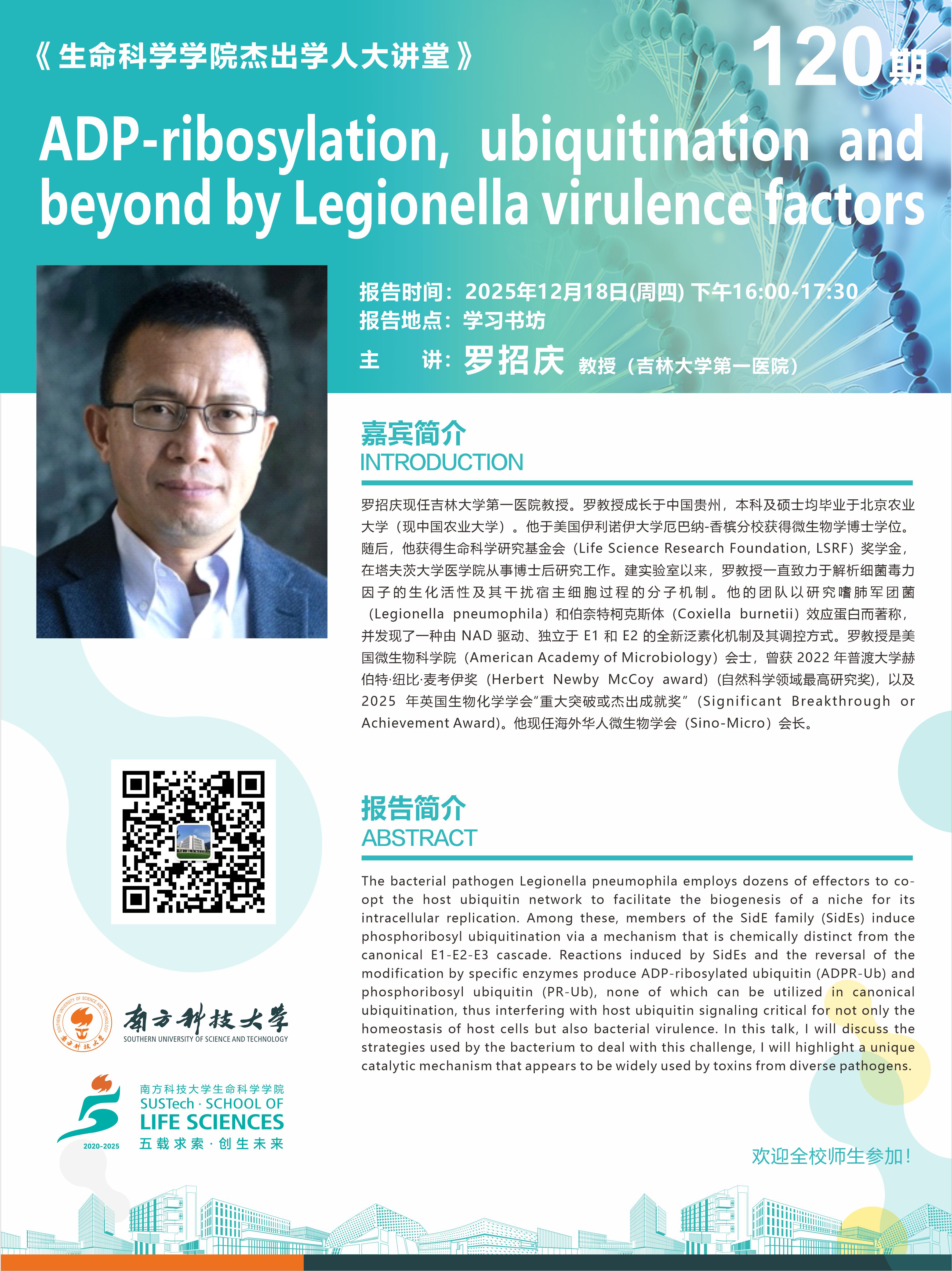 罗招庆现任吉林大学第一医院教授。罗教授成长于中国贵州,本科及硕士均毕业于北京农业大学(现中国农业大学)。他于美国伊利诺伊大学厄巴纳-香槟分校获得微生物学博士学位。随后,他获得生命科学研究基金会(Life Science Research Foundation, LSRF)奖学金,在塔夫茨大学医学院从事博士后研究工作。建实验室以来,罗教授一直致力于解析细菌毒力因子的生化活性及其干扰宿主细胞过程的分子机制。他的团队以研究嗜肺军团菌(Legionella pneumophila)和伯奈特柯克斯体(Coxiella burnetii)效应蛋白而著称,并发现了一种由 NAD 驱动、独立于 E1 和 E2 的全新泛素化机制及其调控方式。罗教授是美国微生物科学院(American Academy of Microbiology)会士,曾获 2022 年普渡大学赫伯特·纽比·麦考伊奖 (Herbert Newby McCoy award) (自然科学领域最高研究奖),以及 2025 年英国生物化学学会“重大突破或杰出成就奖” (Significant Breakthrough or Achievement Award)。他现任海外华人微生物学会(Sino-Micro)会长。