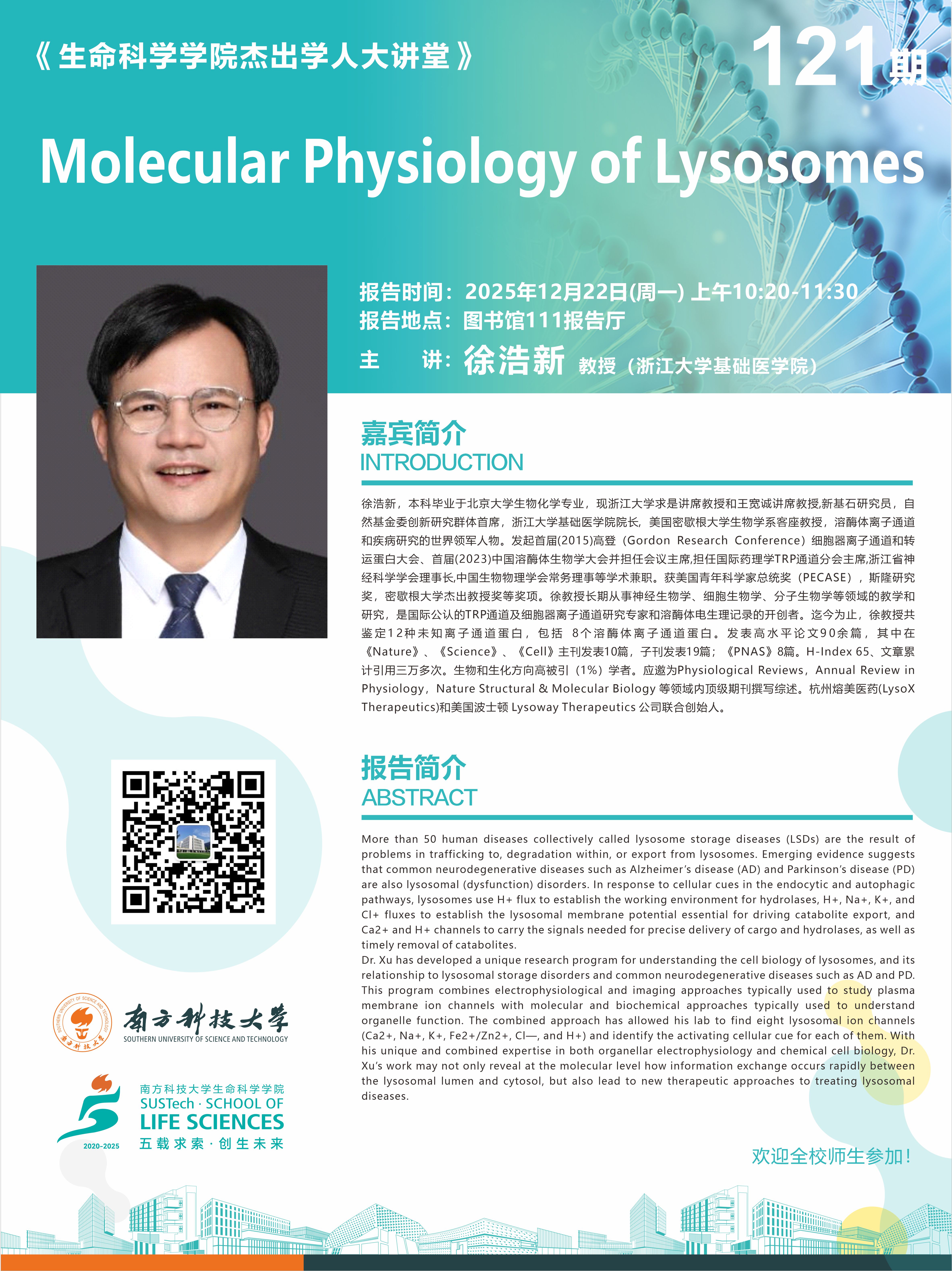 徐浩新,本科毕业于北京大学生物化学专业,现浙江大学求是讲席教授和王宽诚讲席教授,新基石研究员,自然基金委创新研究群体首席,浙江大学基础医学院院长,美国密歇根大学生物学系客座教授,溶酶体离子通道和疾病研究的世界领军人物。发起首届(2015)高登(Gordon Research Conference)细胞器离子通道和转运蛋白大会、首届(2023)中国溶酶体生物学大会并担任会议主席,担任国际药理学TRP通道分会主席,浙江省神经科学学会理事长,中国生物物理学会常务理事等学术兼职。获美国青年科学家总统奖(PECASE),斯隆研究奖,密歇根大学杰出教授奖等奖项。徐教授长期从事神经生物学、细胞生物学、分子生物学等领域的教学和研究,是国际公认的TRP通道及细胞器离子通道研究专家和溶酶体电生理记录的开创者。迄今为止,徐教授共鉴定12种未知离子通道蛋白,包括 8个溶酶体离子通道蛋白。发表高水平论文90余篇,其中在《Nature》、《Science》、《Cell》主刊发表10篇,子刊发表19篇;《PNAS》8篇。H-Index 65、文章累计引用三万多次。生物和生化方向高被引(1%)学者。应邀为Physiological Reviews,Annual Review in Physiology,Nature Structural & Molecular Biology 等领域内顶级期刊撰写综述。杭州熔美医药(LysoX Therapeutics)和美国波士顿 Lysoway Therapeutics 公司联合创始人。