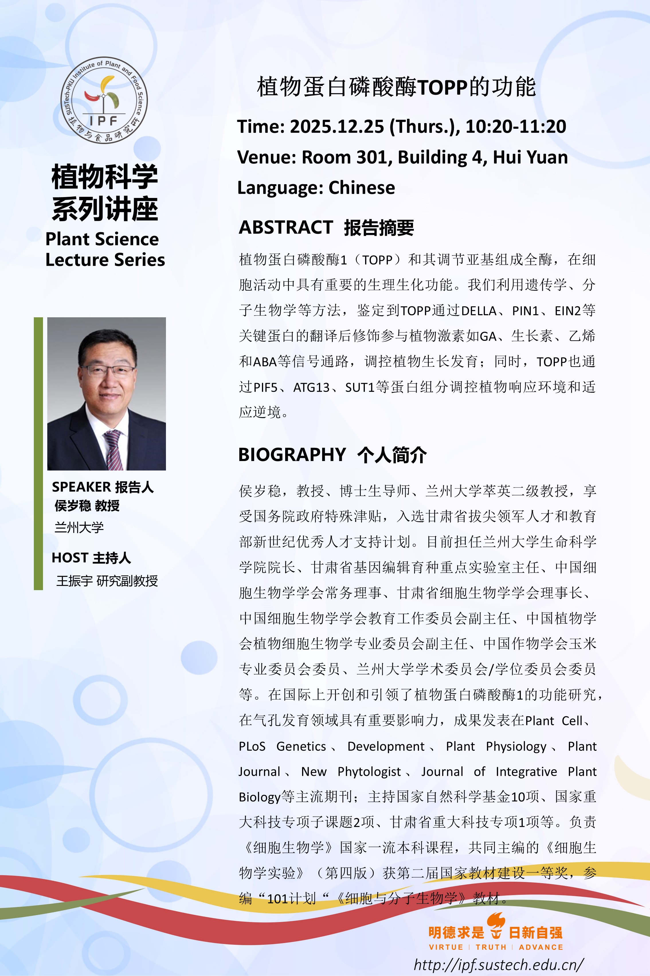 个人简介:侯岁稳,教授、博士生导师、兰州大学萃英二级教授,享受国务院政府特殊津贴,入选甘肃省拔尖领军人才和教育部新世纪优秀人才支持计划。目前担任兰州大学生命科学学院院长、甘肃省基因编辑育种重点实验室主任、中国细胞生物学学会常务理事、甘肃省细胞生物学学会理事长、中国细胞生物学学会教育工作委员会副主任、中国植物学会植物细胞生物学专业委员会副主任、中国作物学会玉米专业委员会委员、兰州大学学术委员会/学位委员会委员等。在国际上开创和引领了植物蛋白磷酸酶1的功能研究,在气孔发育领域具有重要影响力,成果发表在Plant Cell、PLoS Genetics、Development、Plant Physiology、Plant Journal、New Phytologist、Journal of Integrative Plant Biology等主流期刊;主持国家自然科学基金10项、国家重大科技专项子课题2项、甘肃省重大科技专项1项等。负责《细胞生物学》国家一流本科课程,共同主编的《细胞生物学实验》(第四版)获第二届国家教材建设一等奖,参编“101计划“《细胞与分子生物学》教材。