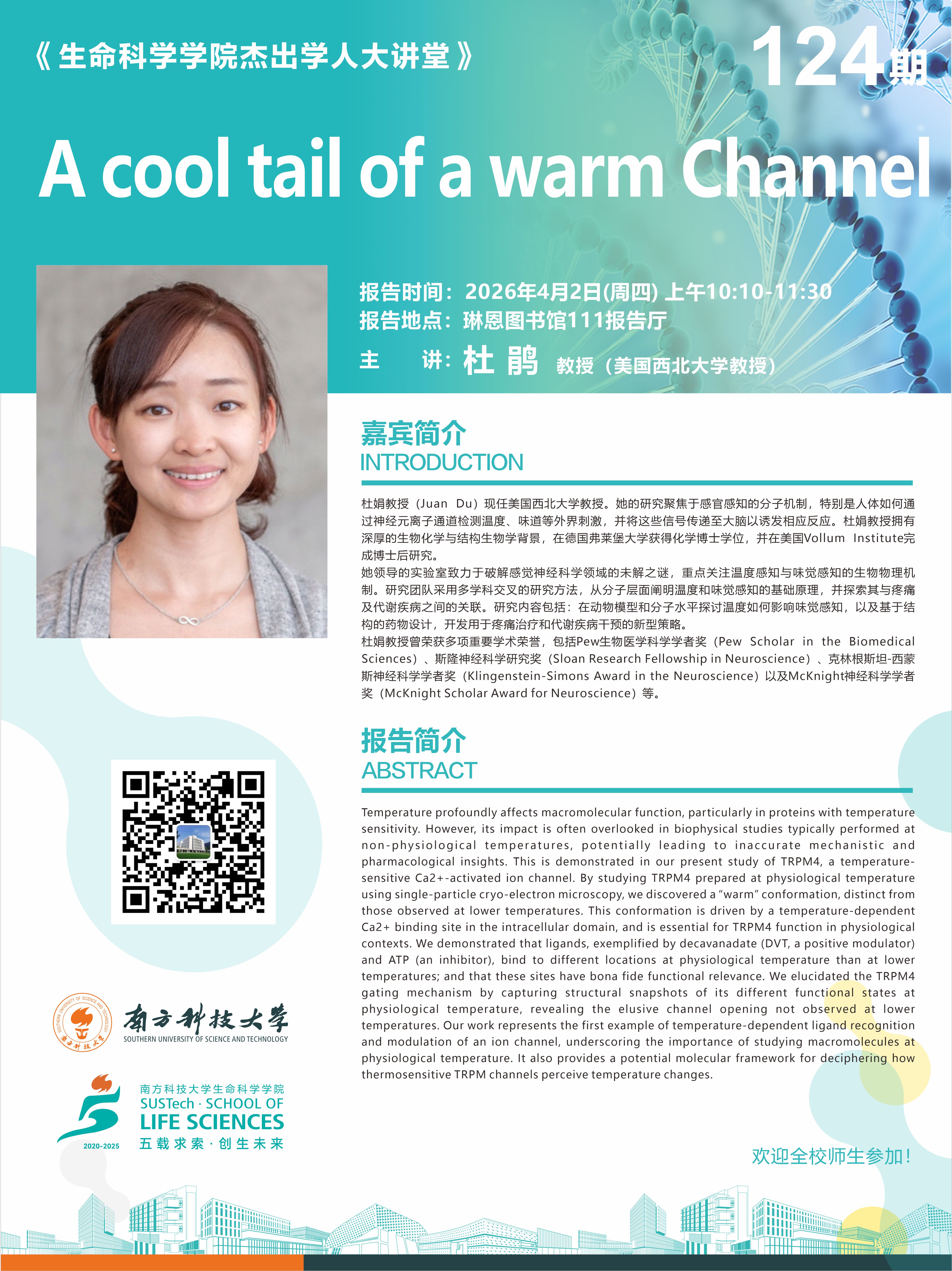 杜娟教授(Juan Du)现任美国西北大学教授。她的研究聚焦于感官感知的分子机制,特别是人体如何通过神经元离子通道检测温度、味道等外界刺激,并将这些信号传递至大脑以诱发相应反应。杜娟教授拥有深厚的生物化学与结构生物学背景,在德国弗莱堡大学获得化学博士学位,并在美国Vollum Institute完成博士后研究。