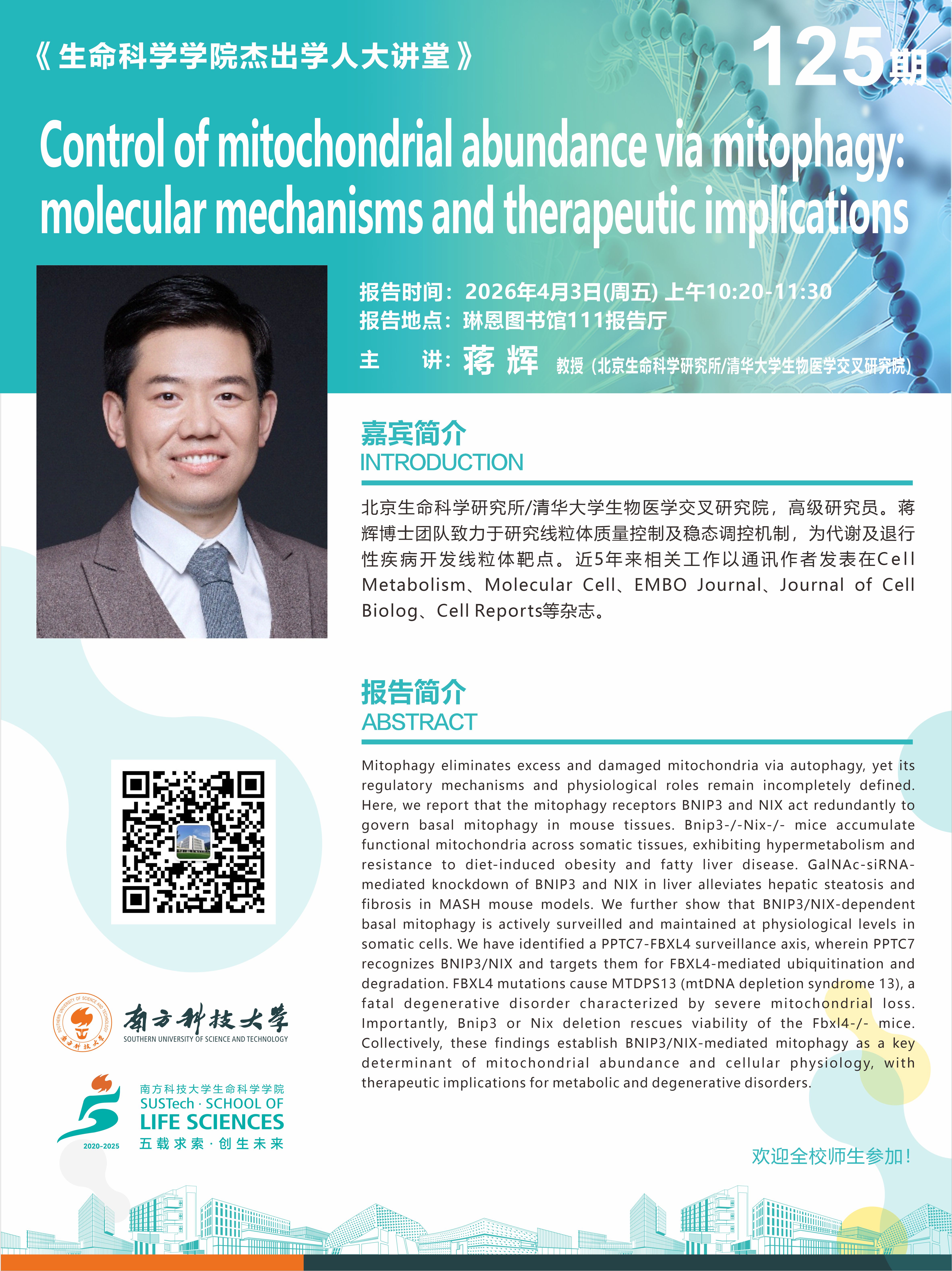 主 讲:蒋辉 教授(北京生命科学研究所/清华大学生物医学交叉研究院)