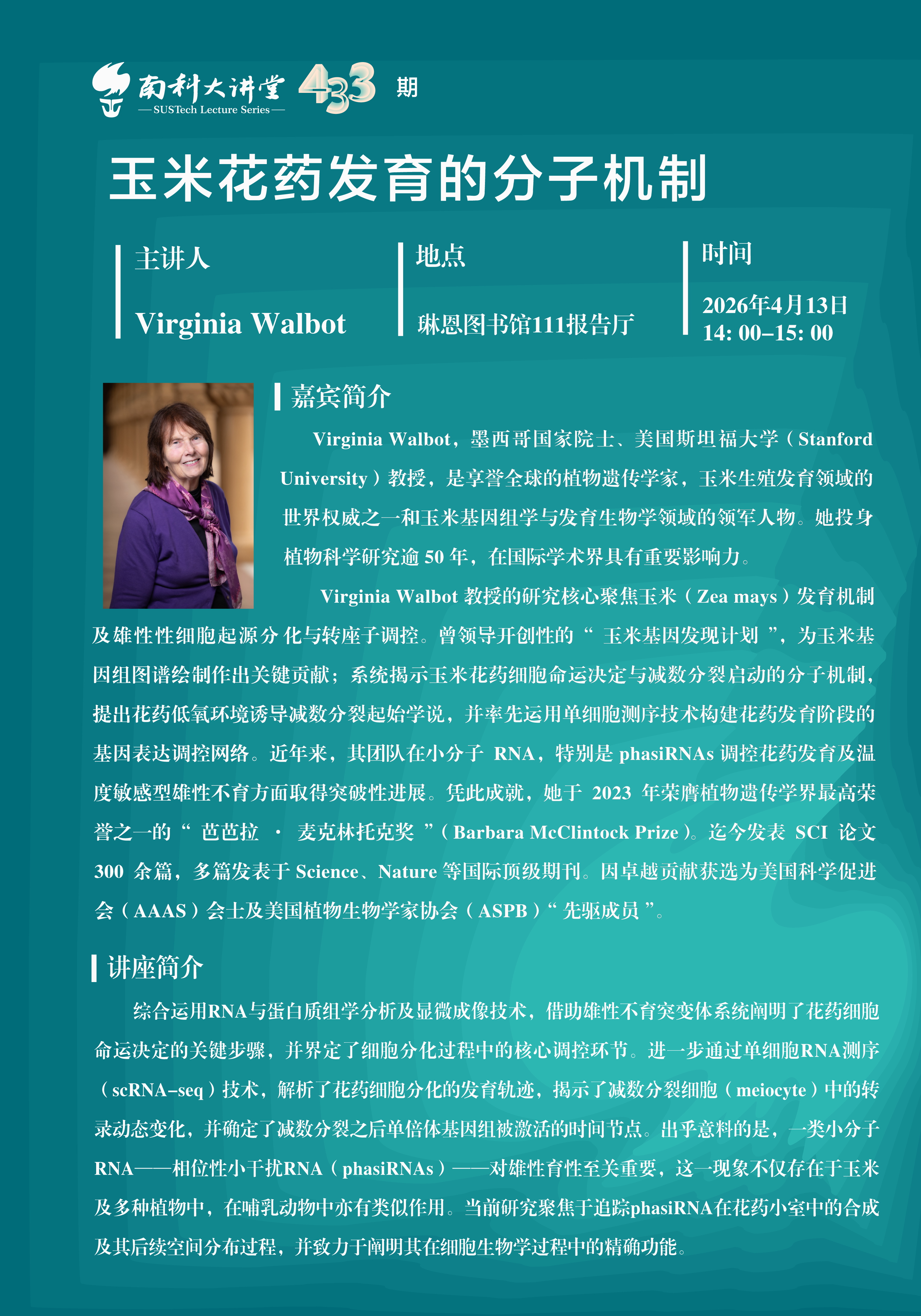 Virginia Walbot 教授的研究核心聚焦玉米(Zea mays)发育机制及雄性性细胞起源分化与转座子调控。曾领导开创性的“玉米基因发现计划”,为玉米基因组图谱绘制作出关键贡献;系统揭示玉米花药细胞命运决定与减数分裂启动的分子机制,提出花药低氧环境诱导减数分裂起始学说,并率先运用单细胞测序技术构建花药发育阶段的基因表达调控网络。近年来,其团队在小分子RNA,特别是 phasiRNAs 调控花药发育及温度敏感型雄性不育方面取得突破性进展。凭此成就,她于2023年荣膺植物遗传学界最高荣誉之一的“芭芭拉·麦克林托克奖”(Barbara McClintock Prize)。迄今发表SCI论文300余篇,多篇发表于 Science、Nature 等国际顶级期刊。因卓越贡献获选为美国科学促进会(AAAS)会士及美国植物生物学家协会(ASPB)“先驱成员”。