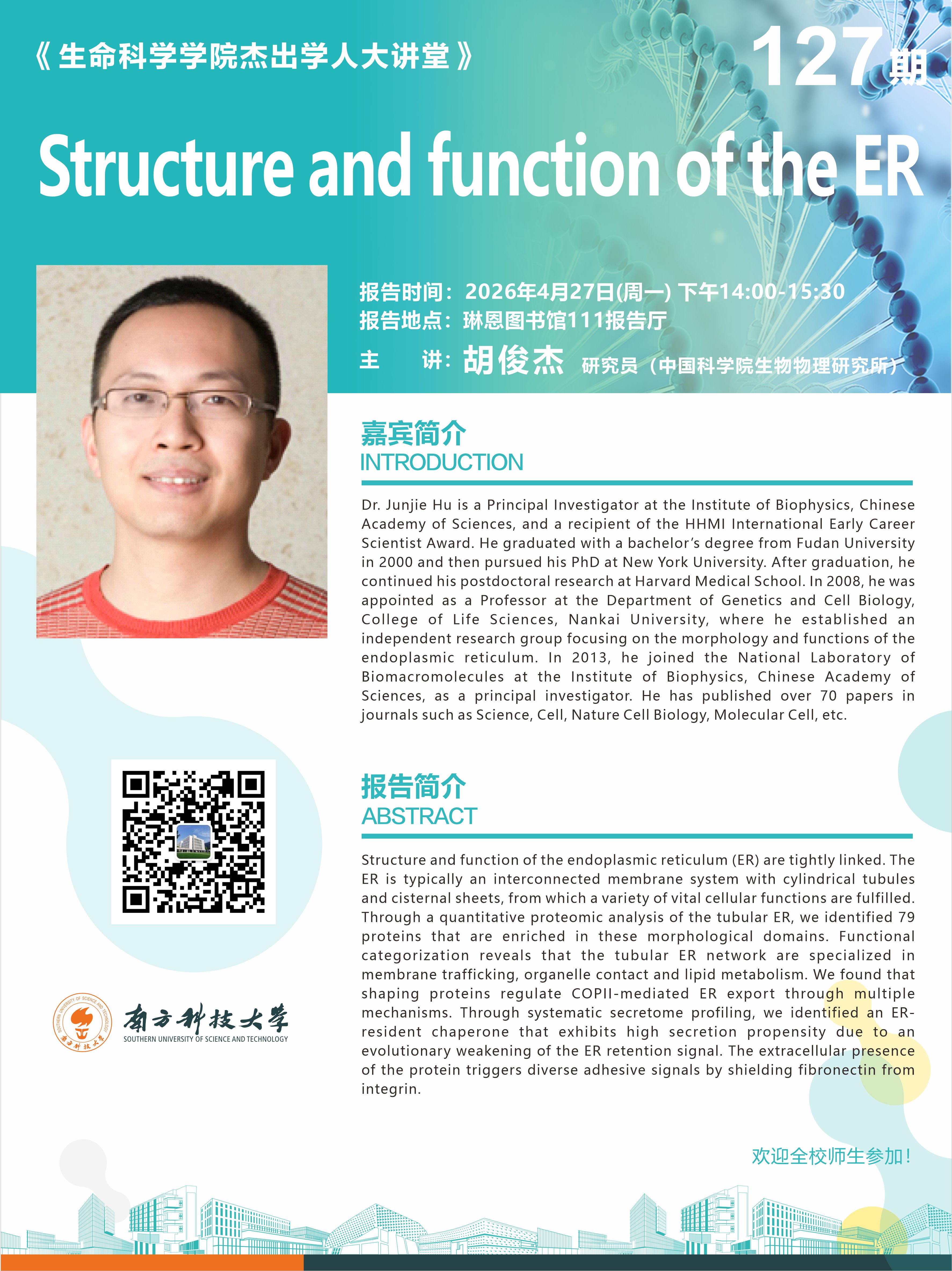 Dr. Junjie Hu is a Principal Investigator at the Institute of Biophysics, Chinese Academy of Sciences, and a recipient of the HHMI International Early Career Scientist Award. He graduated with a bachelor’s degree from Fudan University in 2000 and then pursued his PhD at New York University. After graduation, he continued his postdoctoral research at Harvard Medical School. In 2008, he was appointed as a Professor at the Department of Genetics and Cell Biology, College of Life Sciences, Nankai University, where he established an independent research group focusing on the morphology and functions of the endoplasmic reticulum. In 2013, he joined the National Laboratory of Biomacromolecules at the Institute of Biophysics, Chinese Academy of Sciences, as a principal investigator. He has published over 70 papers in journals such as Science, Cell, Nature Cell Biology, Molecular Cell, etc.