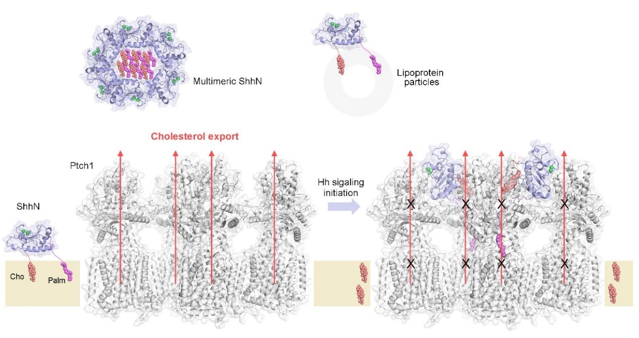 脂化Shh抑制Ptch1四聚体的模型示意图